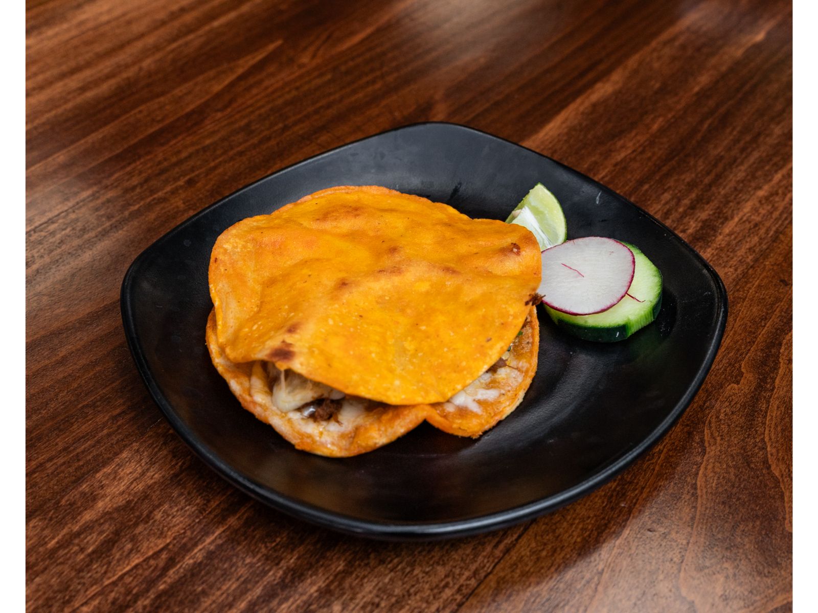 2 corn tortillas ,cheese,birria,onions ,cilantro & sauce