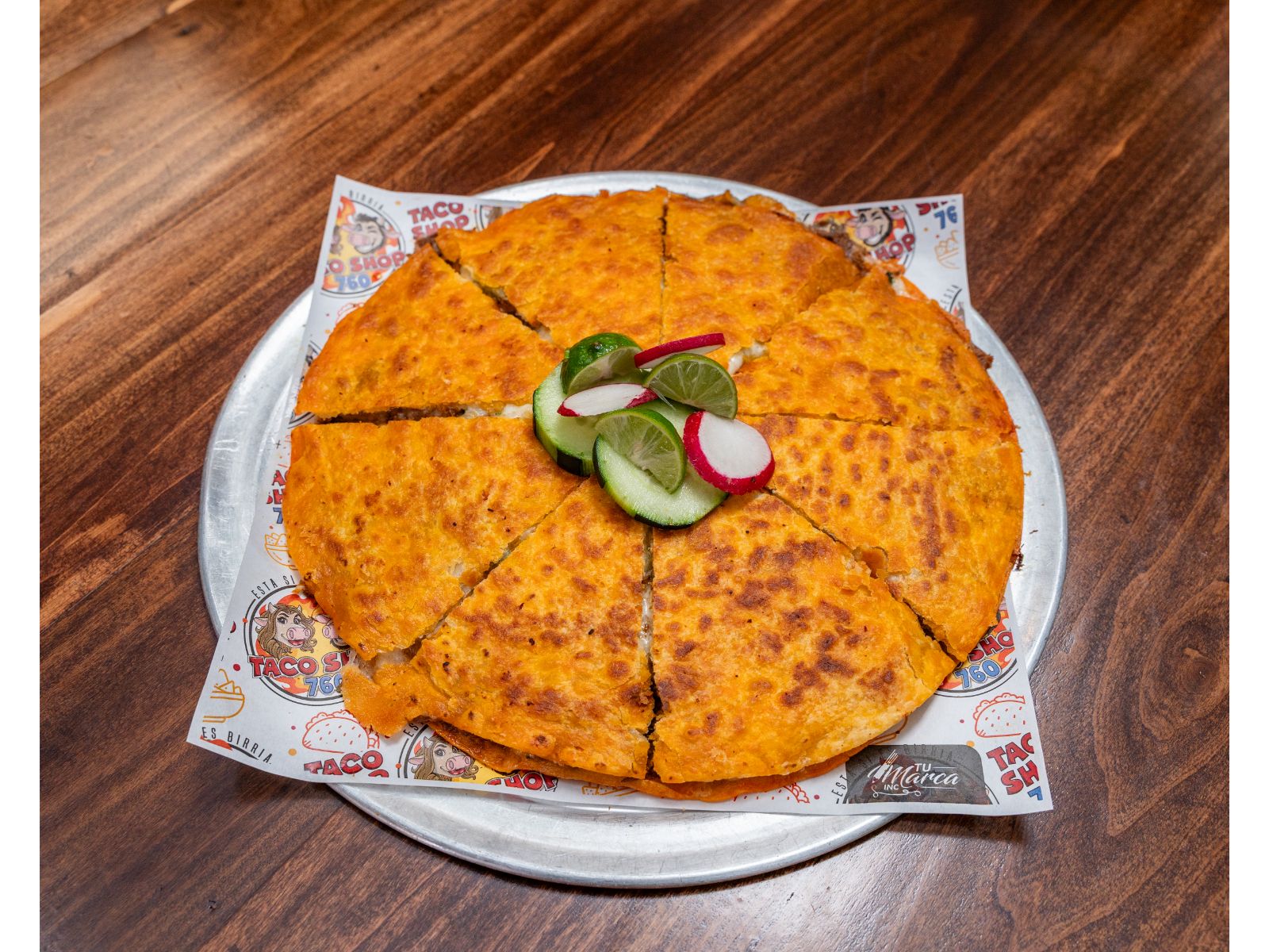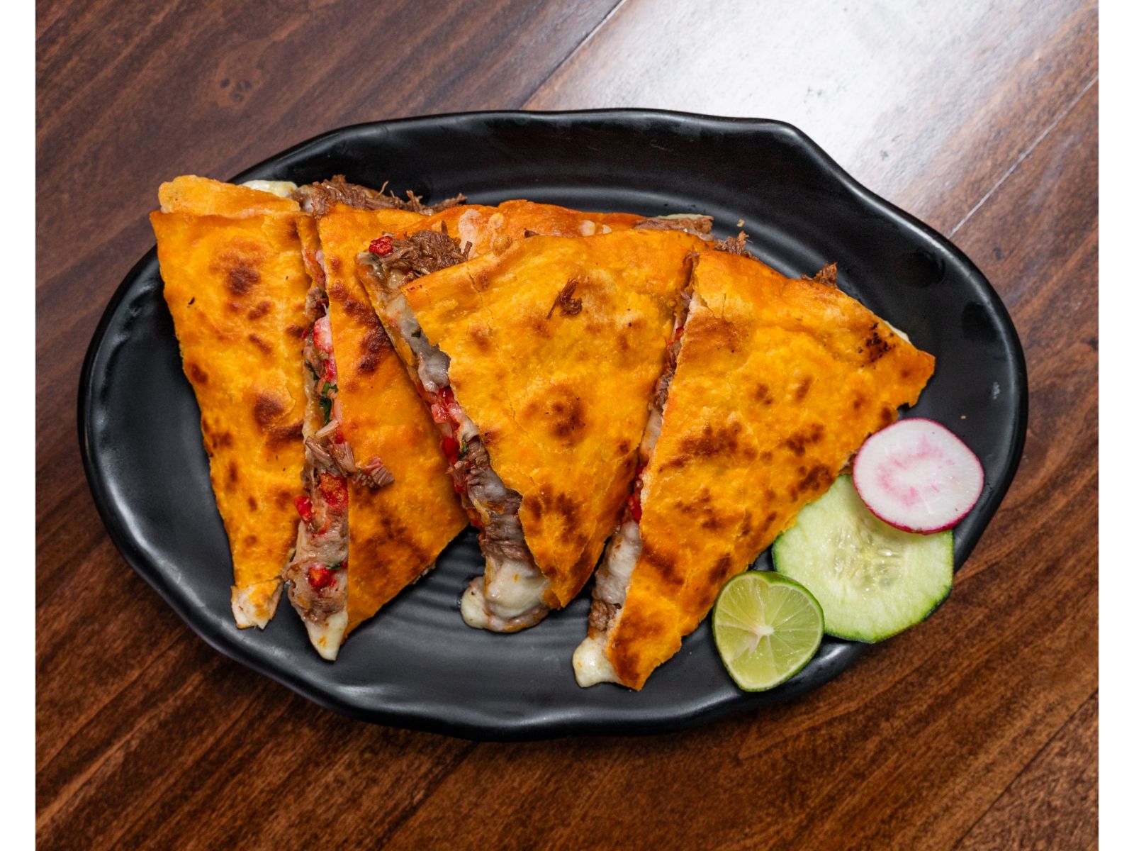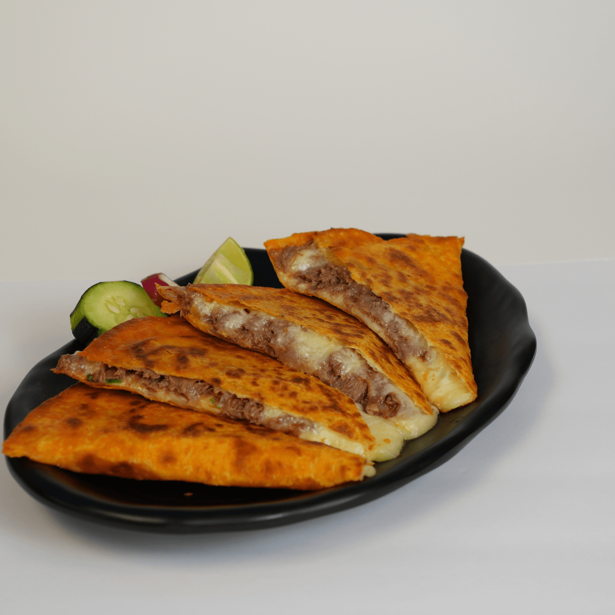 FLOUR QUESADILLA,CHEESE,BIRRIA.ONIONS CILANTRO & SALSA
