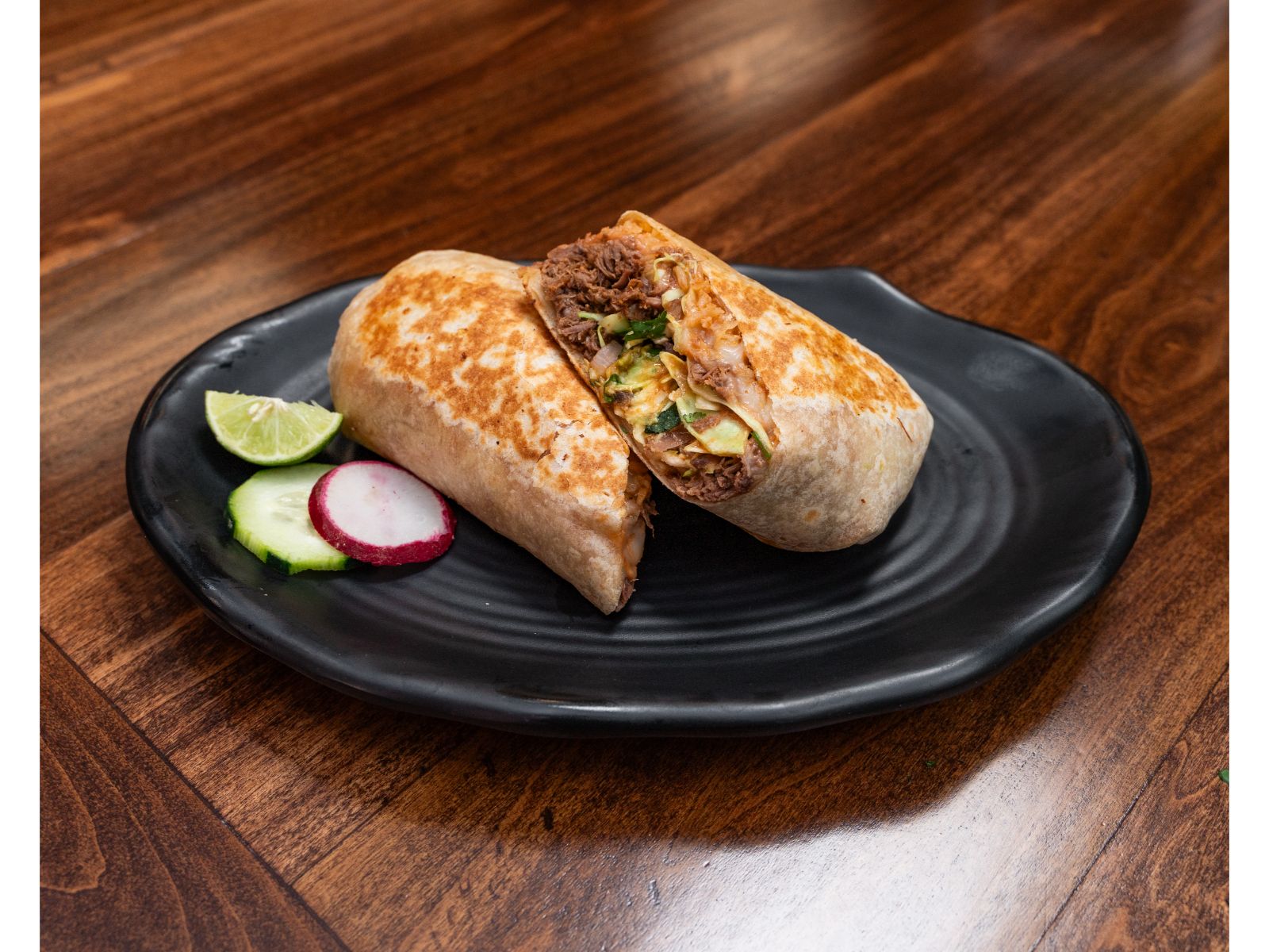 FLOUR TORTILLA,RICE,CHEESE,BEANS,BIRRIA,MIX ,ONIONS ,AVOCADO & SAUCE