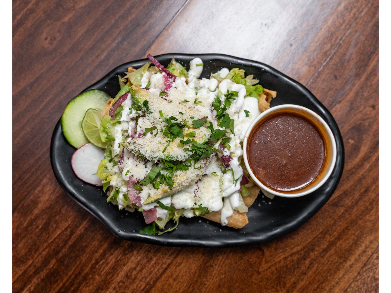 Tostada , beans,birria, lettuce,onions,sour cream,avocado,cotija cheese,cilantro & birria broth