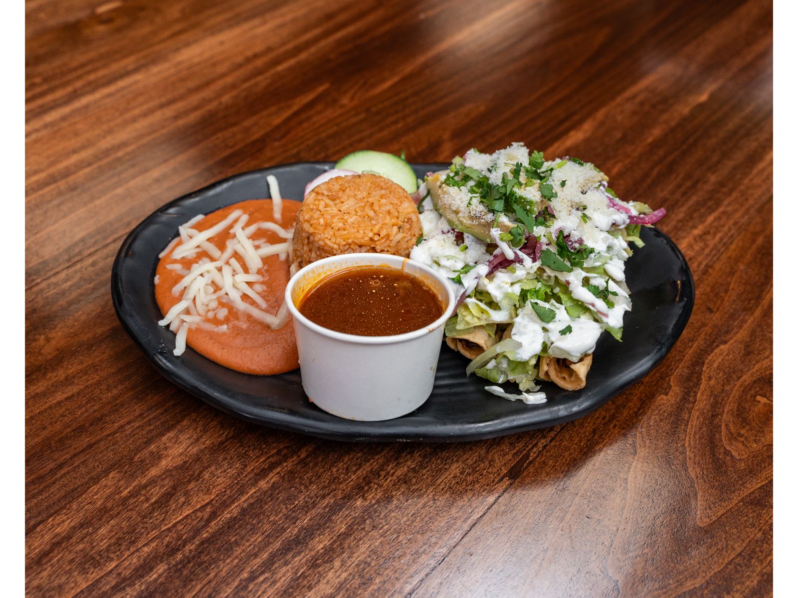4 BEEF FLAUTAS TOPPED WITH LETTUCE ,ONIONS,SOUR CREAM,AVOCADO,COTIJA CHEESE,CILANTRO, BIRRIA BROTH. W/ RICE & BEANS