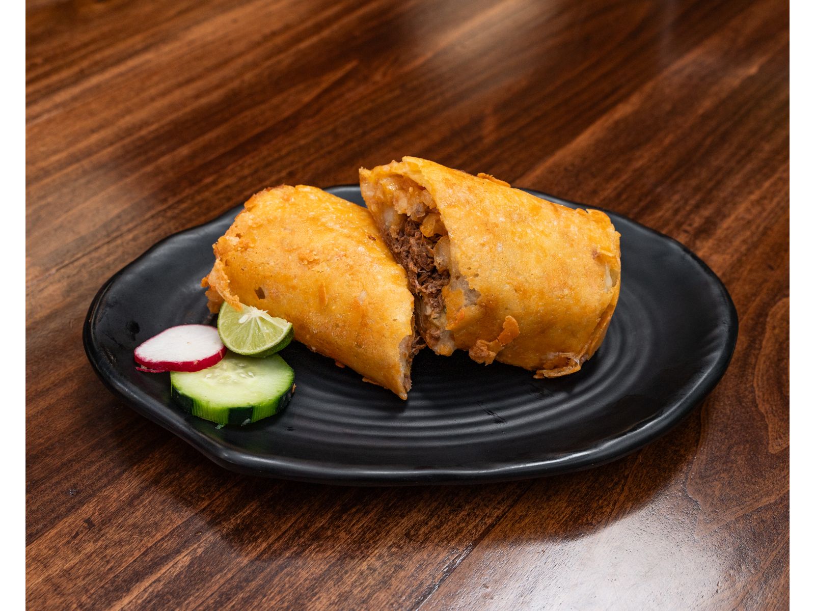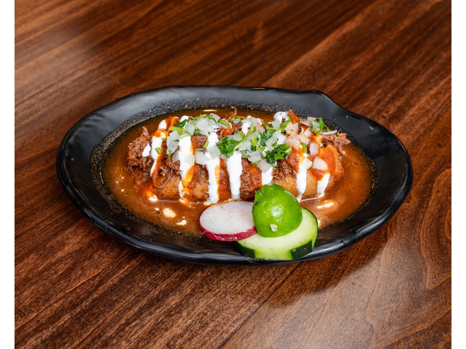 4 BEEF FLAUTAS TOPPED WITH LETTUCE ,ONIONS,SOUR CREAM,AVOCADO,COTIJA CHEESE,CILANTRO, BIRRIA BROTH.