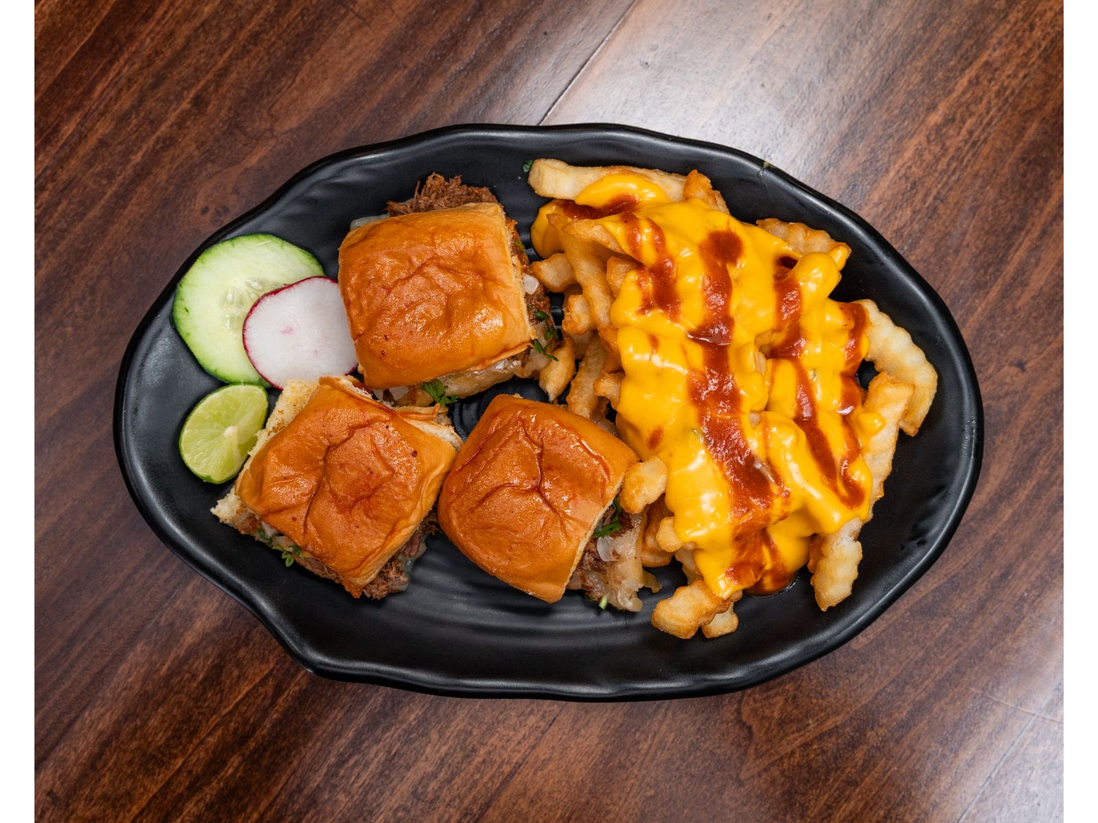 3 slider buns,cheese,birria,onions ,cilantro & sauce W/fries And Naacho Cheese