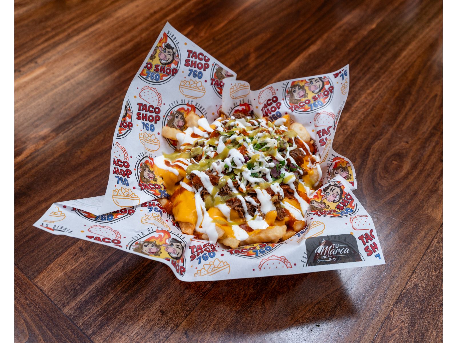 FRIES ,NACHO CHEESE,BIRRIA,MIX,SOUR CREAM,RED & GREEN SALSA