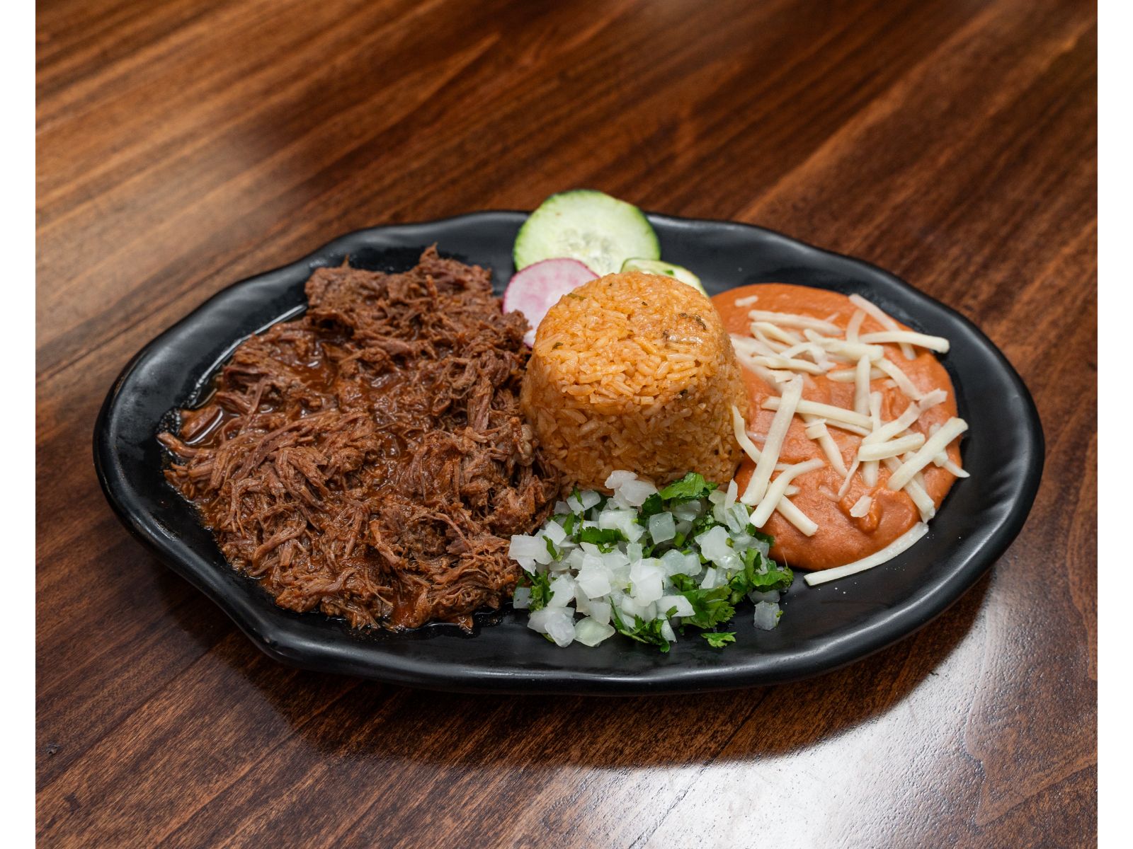 BIRRIA, RICE ,BEANS,CHEESE,ONIONS ,CILANTRO & TORTILLAS