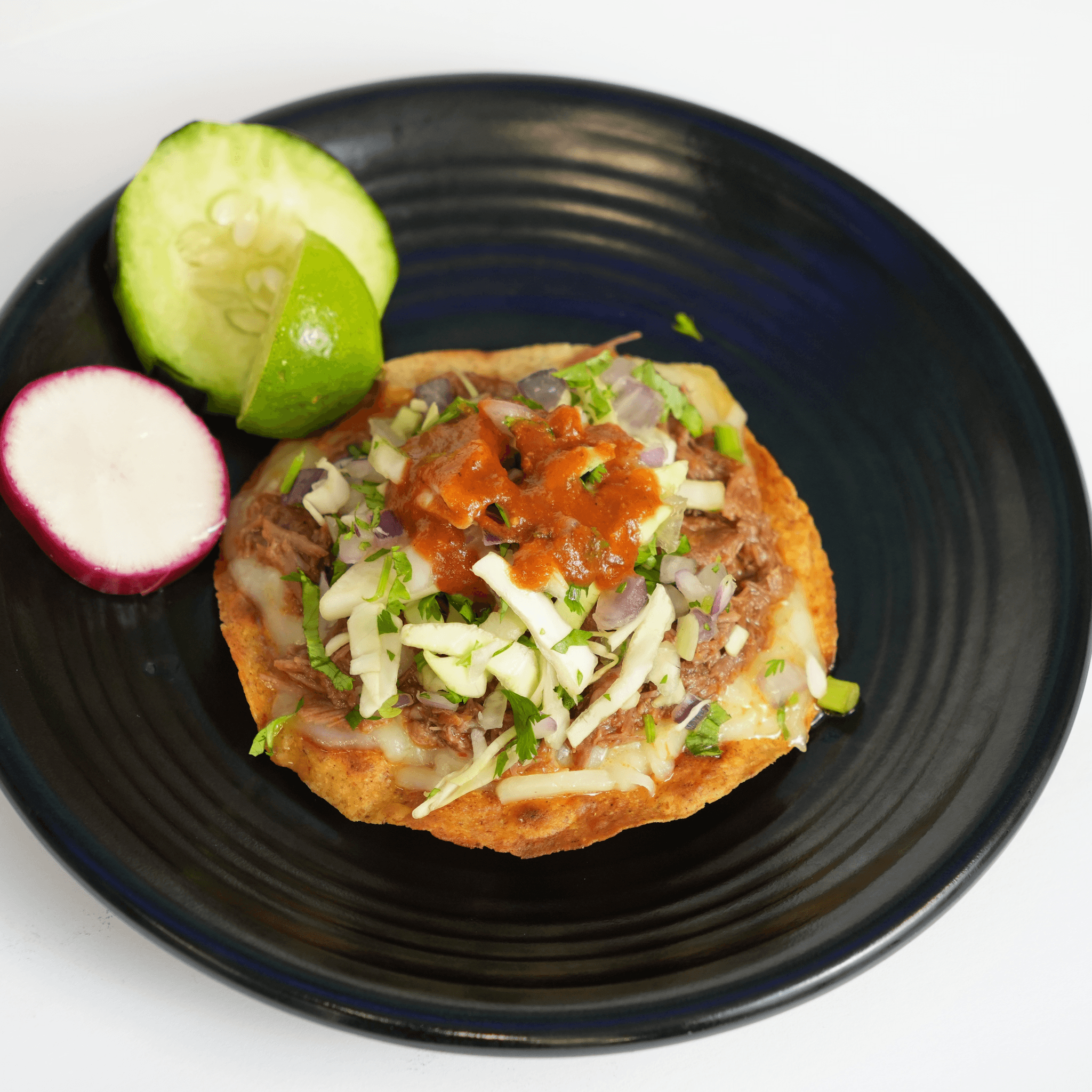 Sope , beans,birria, lettuce,onions,sour cream,avocado,cotija cheese,cilantro & birria broth